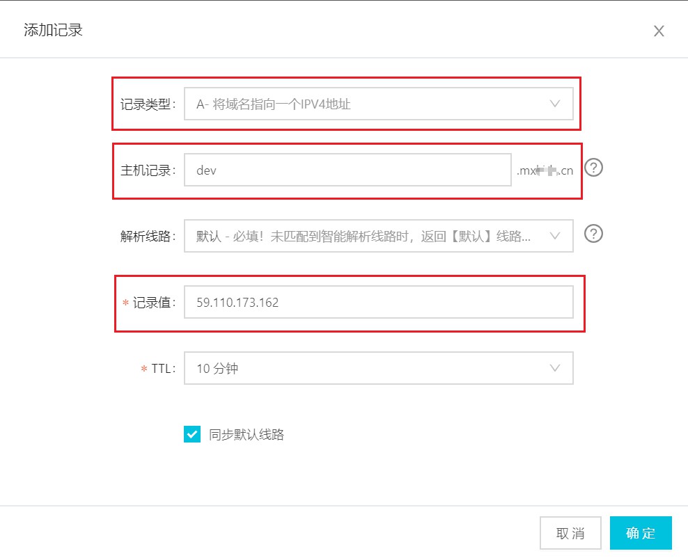 點擊添加紀錄來添加一條新的解析記錄,比如將二級域名dev.mxxx.cn解析到IP地址59.110.173.162上,記錄類型選A: