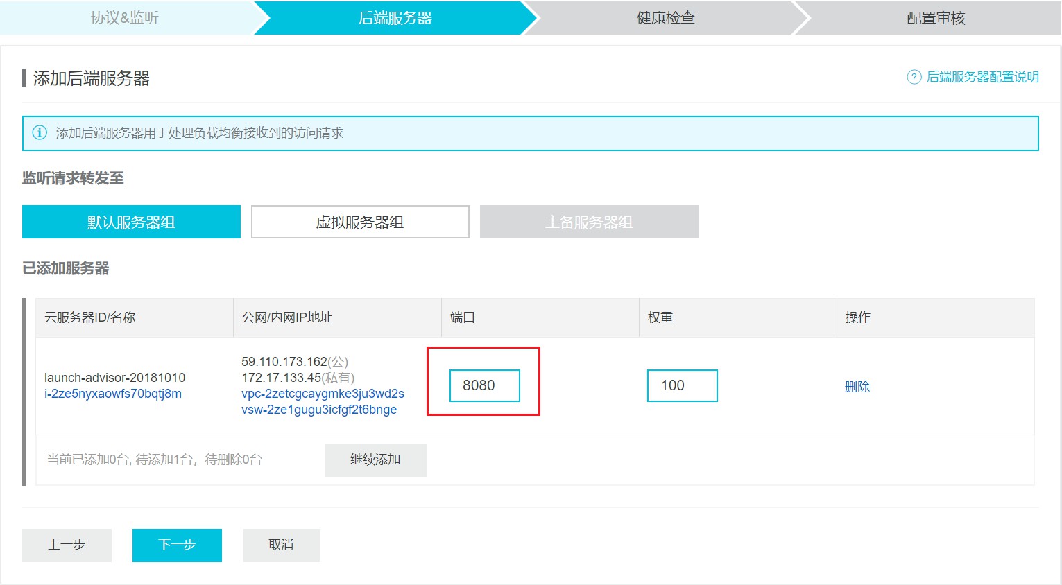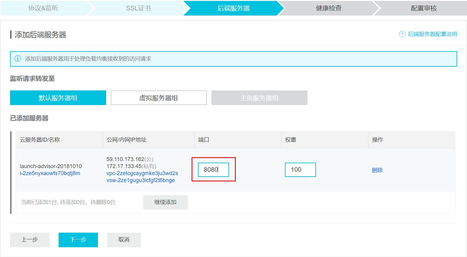 到此,負載均衡已經配置好了HTTP協議訪問,為了演示我們只添加了一臺服務器,真正的負載均衡應該添加多臺服務器分擔壓力。配置過程中我們將負載均衡的80端口指向實際服務器的8080端口,因為我們在59.110.173.162服務器上運行的starter項目運行在8080端口上。也可以更改成其它端口,只要雙方對應上即可。