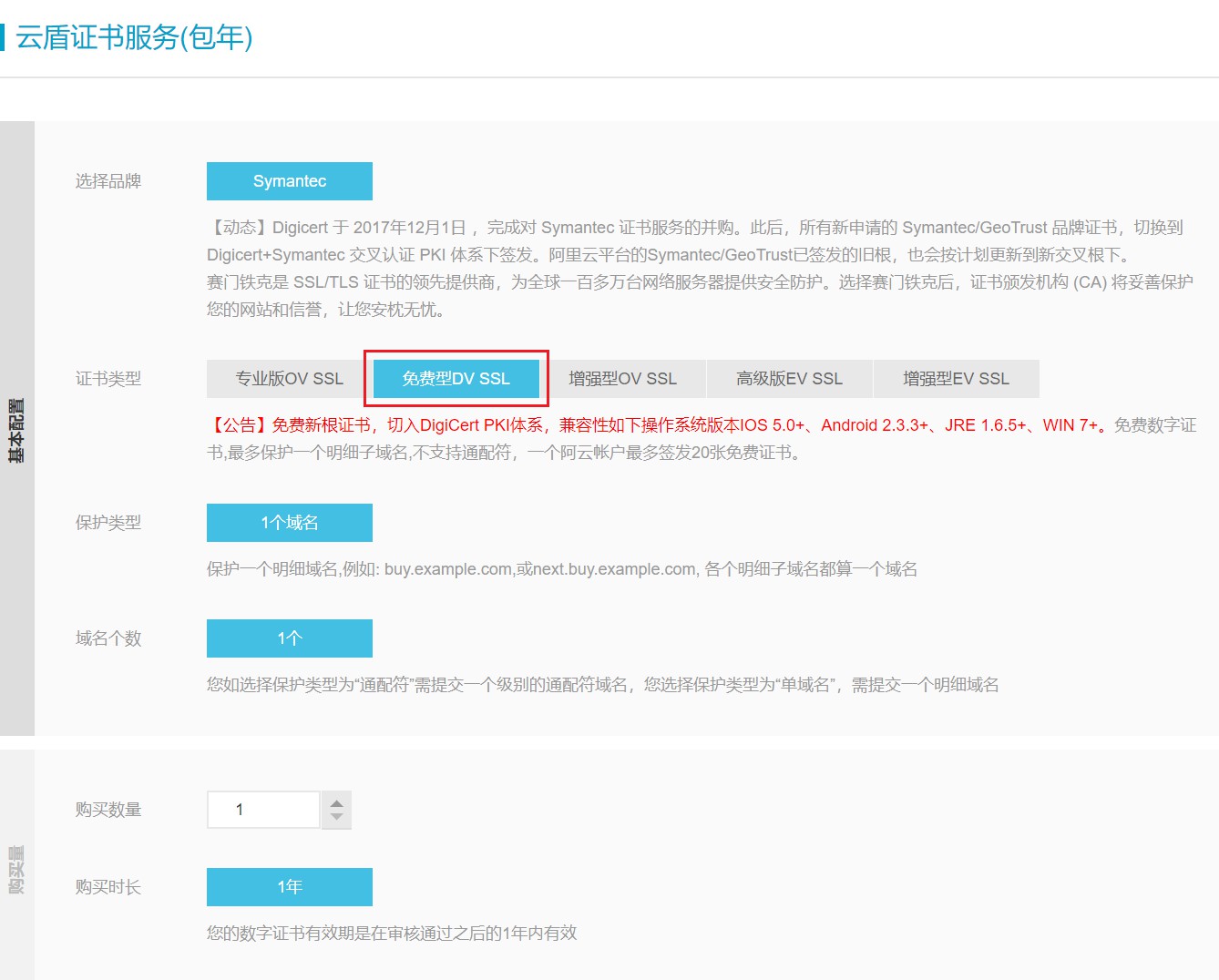 阿里云管理控制臺 > 產品與服務 > SSL證書(應用安全)進入SSL證書頁面可以看到已簽發證書。右上角購買證書進入購買證書頁面,依次點擊 Symantec > 增強型OV SSL就能看到 增強型OV SSL左側多處一個 免費型DV SSL。