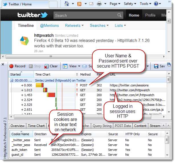 以Twitter為例,它的登錄頁使用了HTTPS,但是登錄以后,其他頁面就變成了HTTP。這時,它的cookie里的session值就暴露了。