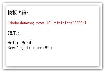 這里我們知道,其實標簽生成的內容其實是這個函數的一個返回值,這里返回的內容都是字符串,也就是函數return $revalue;中的$revalue需要是經過處理后生成的字符串。 $attlist="row|12,titlelen|24";這個是屬性列表,這個經過函數處理后會直接生成變量并復制,我們可以測試下,做如下的修改: $revalue = 'Hello Word!'; $revalue .="Row:".$row.";TitleLen:".$titlelen;