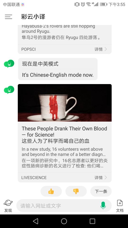 海詞詞典 彩云小譯:一鍵翻譯排版很強大(閱讀翻譯時超好用),此外彩云小譯支持同傳和交換兩種翻譯方式。而且在手機橫屏?xí)r,軟件會變成兩邊可看的模式,一邊還可以設(shè)置轉(zhuǎn)向給對方,這樣就可以實時講話然后給對方看你說的話所對應(yīng)的英文翻譯,同時對方在說英文的時候,又會實時翻譯成中文。(好吧,只能說它是一款翻譯工具了)
