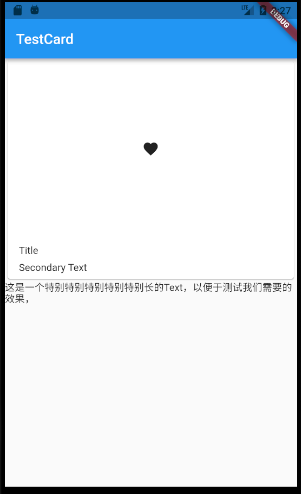 void main() => runApp(MyApp());class MyApp extends StatelessWidget { @override Widget build(BuildContext context) { return MaterialApp( title: 'Flutter Demo', home:new TestDemo() ); } }class TestDemo extends StatelessWidget{ @override Widget build(BuildContext context) { // TODO: implement build return new Scaffold( appBar: AppBar( brightness: Brightness.light, title: Text('TestCard'), ),body: Column( children: <Widget>[ Card( child: Column( crossAxisAlignment: CrossAxisAlignment.start, children: <Widget>[ AspectRatio( aspectRatio: 18.0 / 11.0, child: Icon(Icons.favorite), ), Padding( padding: EdgeInsets.fromLTRB(16.0, 12.0, 16.0, 8.0), child: Column( crossAxisAlignment: CrossAxisAlignment.start, children: <Widget>[ Text('Title'), SizedBox(height: 8.0), Text('Secondary Text'), ], ), ), ], ), ), Expanded( child:Text('這是一個(gè)特別特別特別特別特別長的Text,以便于測(cè)試我們需要的效果,'), ), ], ) ); } } 測(cè)試效果如圖: