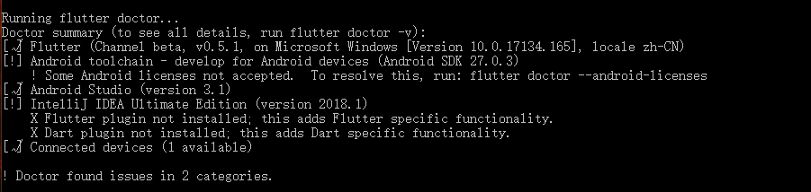 其實到這里,整個flutter的環境就已經搭建好了,當然如果你想要體驗下怎么用flutter寫一個程序,建議你還是先搭建好安卓環境再說,可以參考《Android開發環境搭建》