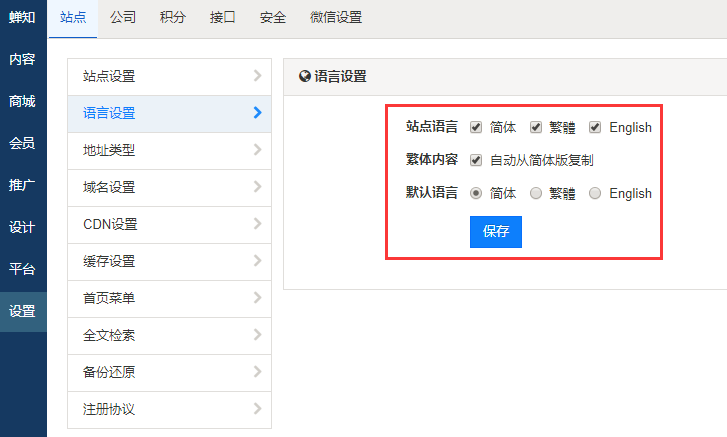 在語言設置界面里用戶可以設定網站支持的語言種類,并制定默認的語言類型。