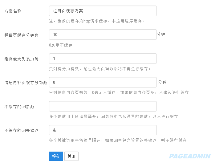 不緩存的url參數,如有的頁面地址格式為http://www.pageadmin.net?keyword=1,如果我們想帶keyword參數的頁面不緩存,那么就填寫上keyword,實際上這個功能主要是搜索頁面這些要構造參數的頁面會用到。