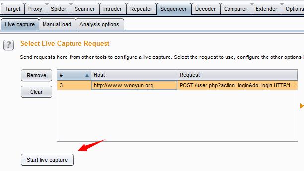 i)Select Live Capture Request - 實時捕獲請求列表中顯示已發送到音序器從其他burp工具的要求。選擇返回你想要分析的標記或其他項目的要求。