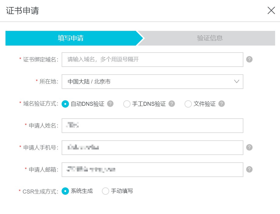 證書購買完之后,會出現在SSL證書列表頁面,找到剛才申請的證書,右下角申請,填寫證書綁定域名,其它選項默認點擊下一步。