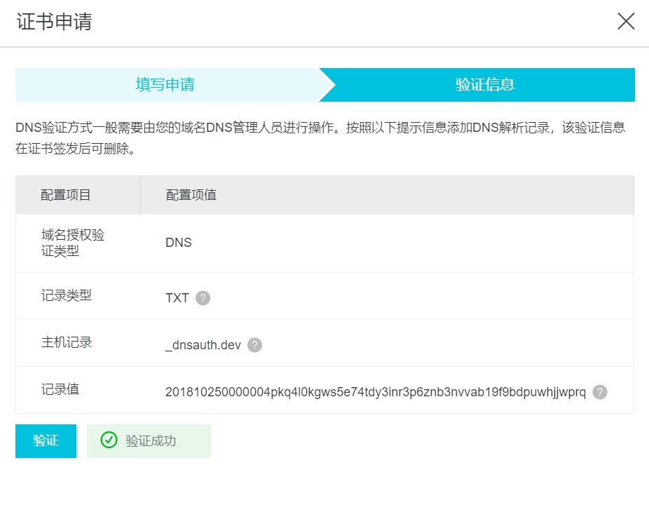 因為上一步 域名驗證方式選中的自動DNS驗證,所以會自動把DNS驗證信息加到對應域名的解析規則里,在新彈出頁面直接點擊驗證,驗證成功后提交審核,需要幾分鐘審核,審核通過就可以使用了。