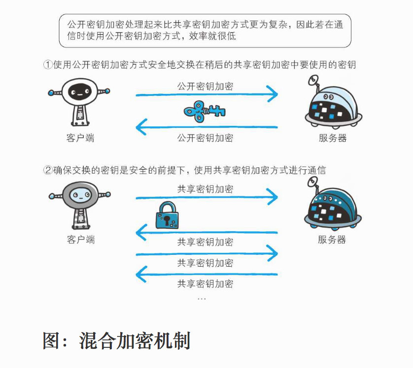 HTTPS 采用共享密鑰加密和公開密鑰加密兩者并用的混合加密機(jī)制。若密鑰能夠?qū)崿F(xiàn)安全交換,那么有可能會考慮僅使用公開密鑰加密來通信。但是公開密鑰加密和共享密鑰加密相比,其處理速度要慢。
