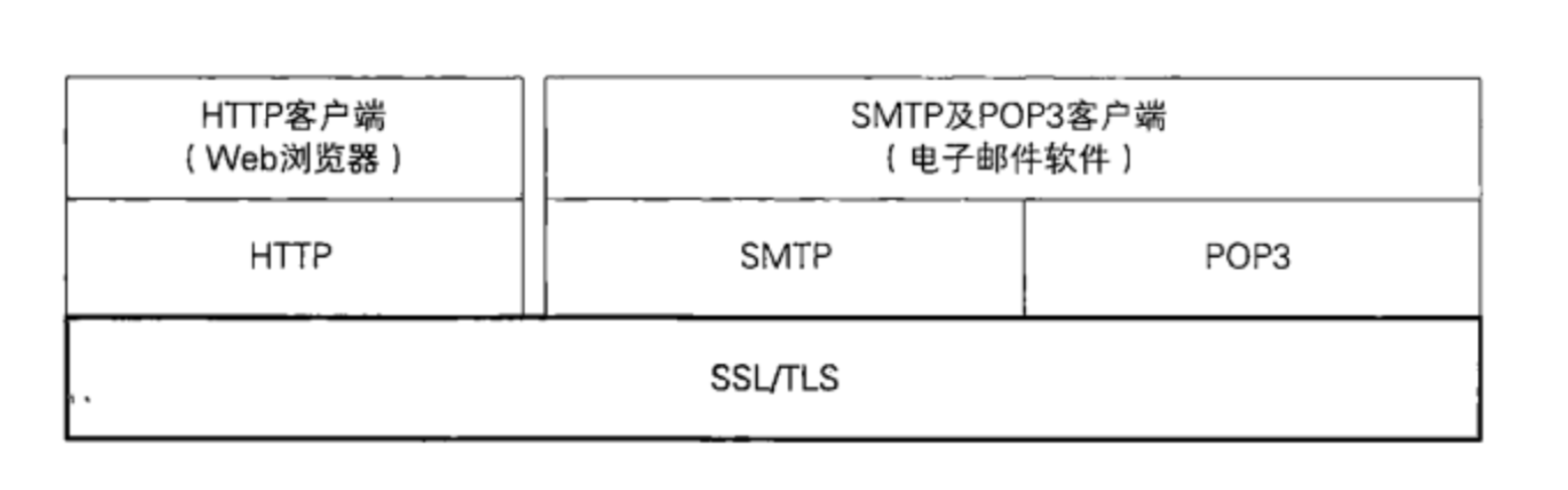 剛才我們提到用SSL/TLS承載HTTP通信,這是因為HTTP是一種很常用的協議。其實SSL/TLS上面不僅可以承載 HTTP,還可以承載其他很多協議。例如,發送郵件時使用的SMTP(Simple Mail Transfer Protocol, 簡單郵件傳輸 協議)和接收郵件時使用的POP3(Post Oice Protocol,郵局協議)都可以用SSL/TLS進行承載。在這樣的情況 下,SSL/TLS就可以對收發的郵件進行保護。