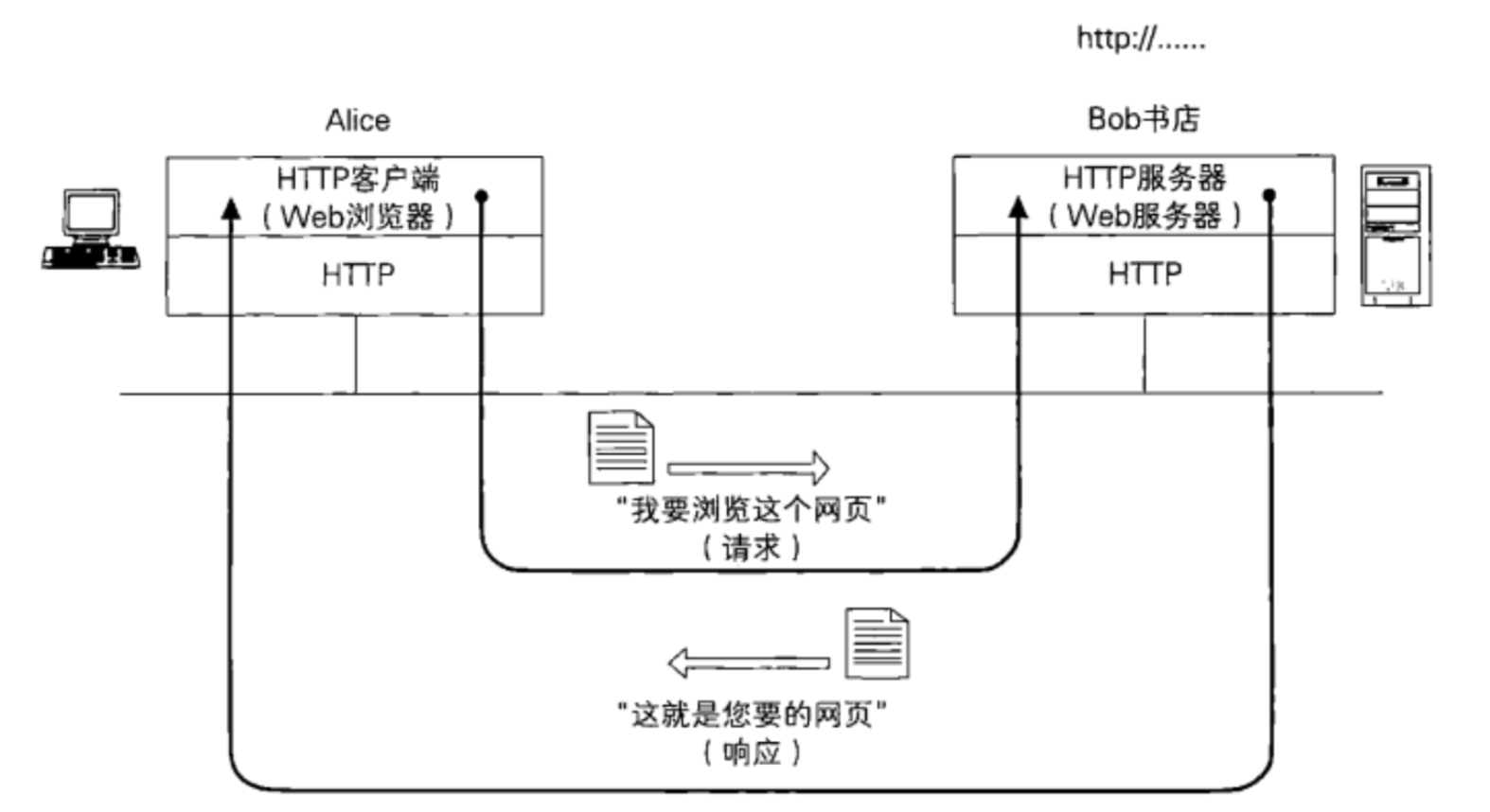 當Alice點擊網頁上的鏈接或者輸人URL時,Web瀏覽器就會通過網絡向Web服務器發送一個 “我要瀏覽這個網 頁“,的請求(request)。