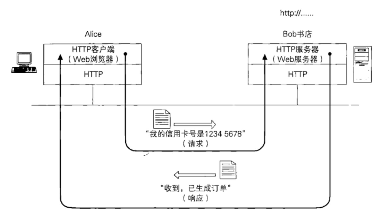Alice向Bob書店發送信用卡號也是使用HTTP來完成的(下圖)。Alice輸人信用卡號之后按下提交按鈕,這時客 戶端(Web瀏覽器)就會將信用卡號作為HTTP請求發送給服務器。服務器則會將“生成訂單"的網頁作為HTTP響 應返回給客戶端。