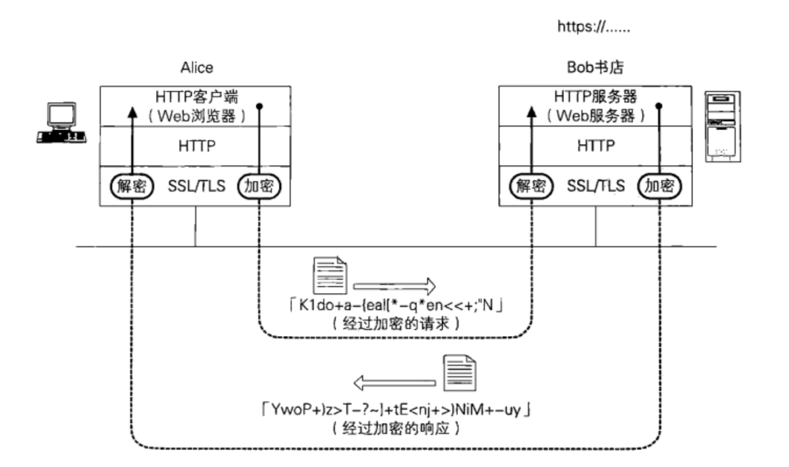 Alice看到Bob書店的網站下面寫著一行字:“在以https://開頭的網頁中輸人的信息將通過SSL/TLS發送以確保安 全"。